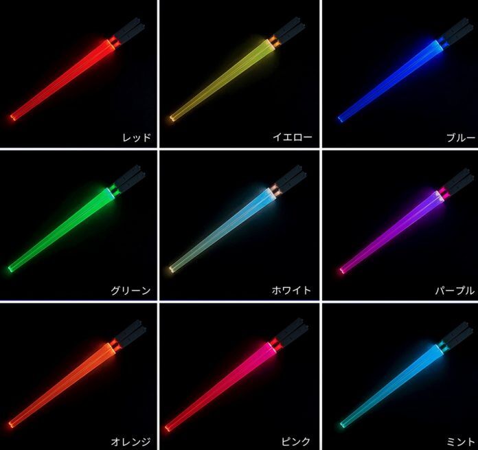 LEDライトの色は、レッド・イエ〇ー・ブルー・グリーン・ホワイト・パープル・オレンジ・ピンク・ミントの全9色から選択可能。2本の箸それぞれを、別の色に設定することもできる。ちなみに電源にはボタン電池LR41を使用(箸1本につき3個)。重量は約15gとのことだ。また、箸の長さは約260mmとなっている。