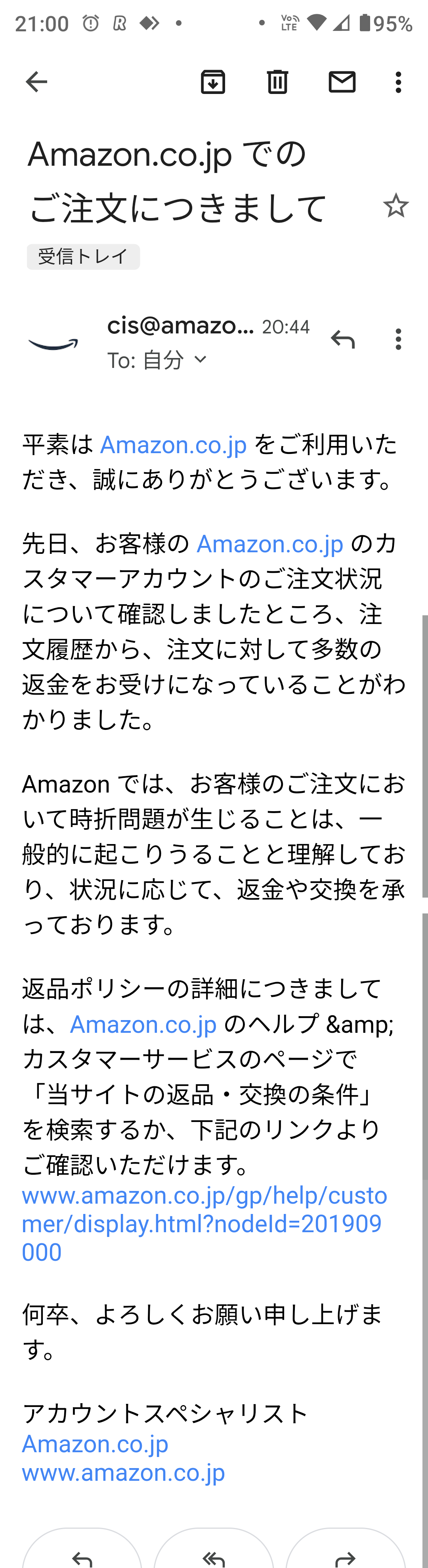 ワイも年間結構な数買って返品数個してるけど一回もこんなメール来たことないぞ